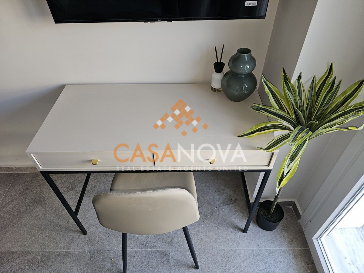 Επιπλέον, διατίθεται πλήρως επιπλωμένο και εξοπλισμένο με 3φυλλη ντουλάπα, καναπέ-κρεβάτι, γραφείο, τηλεόραση, εντοιχισμένο ψυγειοκαταψύκτη, πλυντήριο ρούχων, κεραμική εστία, εντοιχισμένο φούρνο, a/c 12.000btu, φωτιστικά κ.α.